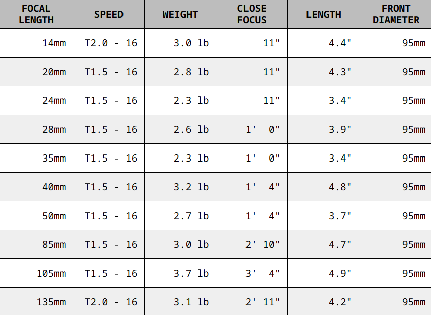 Sigma has brought their superior craftsmanship to the world of full frame cinema glass. With a speed of 1.5-2, this lightweight and compact set covers the full range of the latest large sensor cameras while maintaining smooth mechanics and optical quality. In addition, each set is color matched to ensure no hiccups in your post-production work flow.